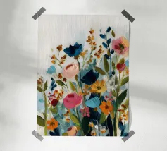 Morbidi petali pastello incontrano profonde tonalità marine e dorate in questo espressivo studio floreale. Le pennellate pittoriche catturano il fascino senza sforzo dei fiori da giardino appena colti che si crogiolano nella prima luce della primavera.