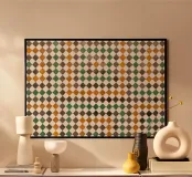 Piastrelle quadrate in Marocco. Piastrelle in nero, arancione, verde.