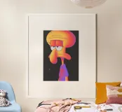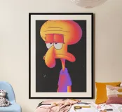 Un personaggio dei cartoni animati con un grande naso e un'espressione stanca, che si illumina di tonalità arancioni e viola.