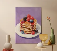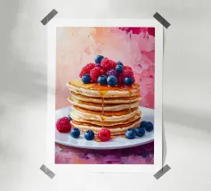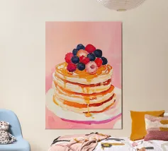 Una pila di pancake è sormontata da fragole e irrorata di sciroppo, su uno sfondo a scacchi bianchi e rosa. I colori vivaci e lo sciroppo lucido creano un aspetto invitante.