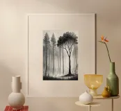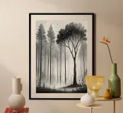 Portate la tranquillità in casa con questa stampa acquerellata monocromatica della foresta. Caratterizzata da fogliame a macchie d'inchiostro e alberi alti ed eleganti su uno sfondo nebbioso, quest'opera d'arte naturalistica astratta crea un'atmosfera calma e moderna.