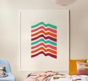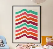 Un poster digitale Op Art e retrofuturistico che presenta linee ondulate orizzontali in una vibrante tavolozza Mid-Century Modern. I colori - verde acqua, rosa caldo, arancione brillante e bordeaux intenso - sono separati da sottili strisce bianche, creando un senso dinamico di profondità e movimento, quasi come un paesaggio desertico colorato o le onde sonore. Questo design vivace aggiunge un immediato tocco vintage e un divertimento massimalista a qualsiasi spazio. Questo download digitale di alta qualità vanta 7000x5000 pixel a 300 dpi, garantendo una chiarezza eccezionale e una qualità di stampa superiore per l'arte di grande formato.