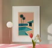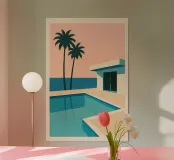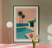 Catturate la quintessenza dell'estetica anni '80 con questa stampa d'arte vibrante e stilizzata, perfetta per gli appassionati di Vaporwave e Synthwave. L'immagine presenta una piscina geometrica e una moderna villa bianca sullo sfondo di un cielo rosa tenue e di un oceano blu intenso. Due palme sagomate rafforzano l'atmosfera lussuosa e tropicale dello stile illustrativo Mid-Century Modern (MCM), evocando il lusso di Malibu o Miami Vice. Questo pezzo è ideale per Dopamine Decor. Il file digitale di qualità superiore (7000x5000 pixel, 300 dpi) garantisce linee incredibilmente nitide e colori saturi per un'immagine di grande impatto e di qualità museale.