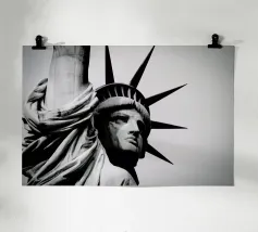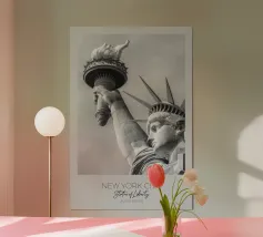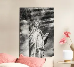 Questa affascinante fotografia in bianco e nero mostra l'iconica Statua della Libertà contro l'imponente skyline di Manhattan, simbolo di libertà e democrazia. Con un design elegante, l'opera d'arte combina l'estetica moderna con la bellezza senza tempo di questo famoso simbolo e aggiunge un tocco di raffinatezza a qualsiasi ambiente.
