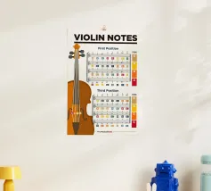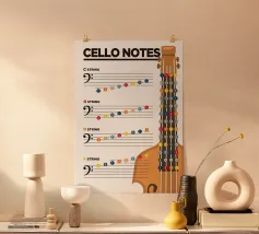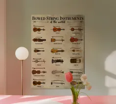 Esplora la bellezza degli strumenti a corda con questa dettagliata tabella didattica che presenta violino, violoncello, viola, chitarra, arpa e ukulele.