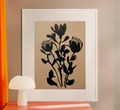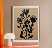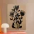 Un'audace silhouette floreale in nero profondo su un caldo sfondo beige. Gli steli, le foglie e i fiori sono resi in netto contrasto, catturando l'eleganza della natura attraverso una forma semplificata. Questa composizione minimale enfatizza la texture, l'ombra e l'equilibrio, fondendo la bellezza botanica con un design grafico moderno.