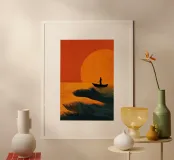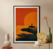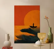 Una figura. Acque infinite. Un cielo in fiamme. Sunset Voyager è una meditazione grafica sulla solitudine e sulla direzione, dove il percorso è fluido e la destinazione indefinita. Il sole arancione incombe su onde dinamiche e lineari, guidando la silhouette solitaria in un mare di silenzio. Perfetto per gli interni moderni che celebrano il simbolismo, il viaggio e l'impatto minimalista. Un pezzo di grande effetto con una tranquilla profondità emotiva.