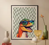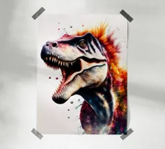 Questo vibrante T-Rex sfoggia un paio di eleganti occhiali da sole, che fondono la forza preistorica con la modernità. Un pezzo audace e divertente per gli amanti dei dinosauri e dell'arte tagliente.