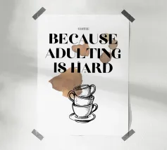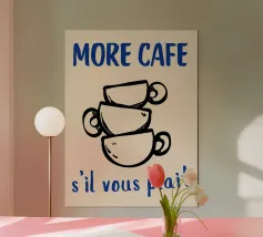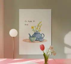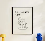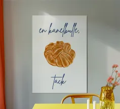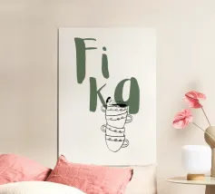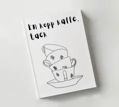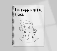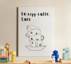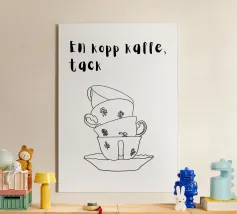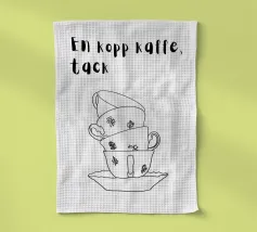 Diverse tazze di caffè sono giocosamente impilate l'una dentro l'altra e formano un motivo armonioso e minimalista. Compare anche la scritta svedese "en kopp kaffe, tack" ("una tazza di caffè, per favore"). La combinazione è calda, invitante e tipicamente scandinava.