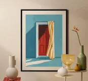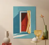 Questa suggestiva stampa d'arte cattura una scena architettonica audace e invitante con un'estetica pulita e moderna. Una vivace porta rossa, incorniciata da finiture bianche, si staglia su una parete blu intenso e freddo. Una giocosa tenda a strisce bianche e arancioni pende dalla parte superiore della cornice, catturata in una graziosa onda come se fosse mossa da una leggera brezza. Le ombre drammatiche proiettate dal sole aggiungono profondità e una qualità dinamica e grafica all'opera. Questo poster digitale di alta qualità, a 7000x5000 pixel e 300 dpi, porta un'esplosione di colore gioioso e un senso di stile unico in qualsiasi spazio con una chiarezza e un dettaglio eccezionali.