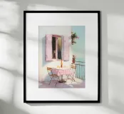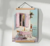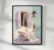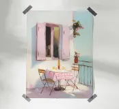 Il motivo raffigura un'affascinante scena di balcone mediterraneo in tenui colori pastello. Un tavolino con una tovaglia rosa, due sedie e una bottiglia invitano a soffermarsi al sole. Le pennellate morbide e la luce calda trasmettono una sensazione di estate, leggerezza e vacanze al mare.