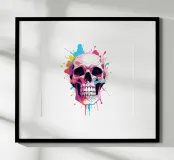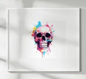 Un'impressionante illustrazione di un teschio con un'esplosione di vibranti spruzzi d'inchiostro sullo sfondo. Questo design audace fonde vibrazioni gotiche e taglienti con l'energia della moderna street art. Perfetto per chi ama un'estetica oscura ma colorata.