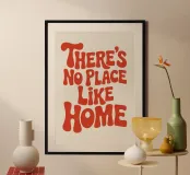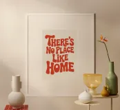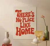La scritta "There's No Place Like Home" appare in grandi lettere rosse su uno sfondo beige chiaro. La tipografia giocosa e leggermente irregolare conferisce al design calore e carattere.