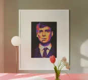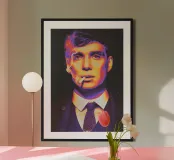 Un ritratto luminoso di Thomas Shelby in abito, che fuma una sigaretta su uno sfondo scuro.