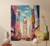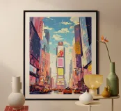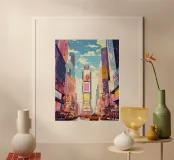 Questa vibrante opera d'arte cattura l'energia elettrica di Times Square a New York. Cartelloni pubblicitari colorati, strade affollate e gli iconici taxi gialli riempiono la scena, creando un'atmosfera cittadina dinamica. Con tinte vivaci e uno stile illustrativo moderno, celebra il battito della vita urbana e lo spirito senza fine di New York.
