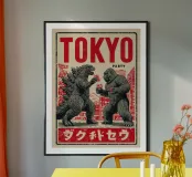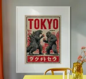 Una decostruzione ironica dei miti pop-culturali dell'orrore: nello stile di una linoleografia stampata a mano, l'opera combina l'estetica retrò dei vecchi manifesti giapponesi dei film di serie B e il fascino rustico della tradizione americana della xilografia. Godzilla e King Kong, i titani della distruzione, non sono qui in battaglia, ma in una posa assurda e amichevole, brindando con tazze rosse. La texture ruvida e le linee marcate danno energia all'immagine. Una dichiarazione audace e umoristica per i collezionisti che amano la forza grafica con un tocco di cultura pop.