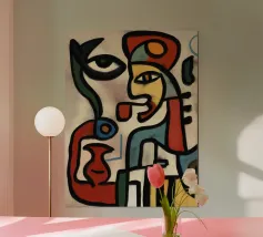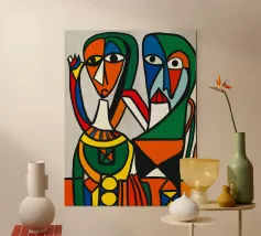 Due figure stilizzate dominano la composizione, caratterizzate da forme astratte e colori vivaci. Una figura appare di profilo mentre l'altra è rivolta in avanti, entrambe con tratti esagerati e una qualità stravagante.