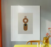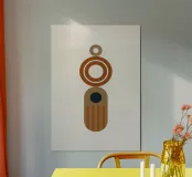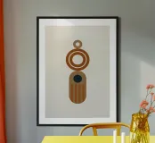 Una composizione astratta sofisticata e mirata, caratterizzata da forme geometriche impilate verticalmente su uno sfondo caldo e bianco sporco. L'opera d'arte ricorda un orecchino o un amuleto stilizzato e sovradimensionato. La sezione superiore è costituita da due anelli concentrici in terracotta profonda/arancio bruciato. La sezione inferiore, allungata, presenta estremità arrotondate, un colore marrone moka, un piccolo cerchio blu scuro e strisce verticali in terracotta. Il design fonde perfettamente la semplicità del Mid-Century Modern con un'estetica boho-chic contemporanea. Questo download digitale di alta qualità (7000x5000 pixel, 300 dpi) garantisce una qualità di stampa eccezionale, offrendo un'ottima qualità di stampa.