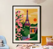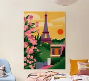 Questa immagine ritrae la Torre Eiffel al tramonto, con fiori rosa in primo piano. La scena è pittoresca e romantica e cattura l'iconico punto di riferimento in una luce meravigliosa.