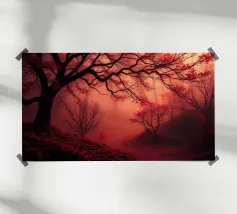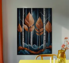 Il dipinto digitale di una foresta autunnale presenta sagome scure di alberi su uno sfondo caldo e dorato. L'opera d'arte testurizzata mostra un fogliame dettagliato nei toni dell'arancione e del marrone, creando una scena di bosco serena e suggestiva.