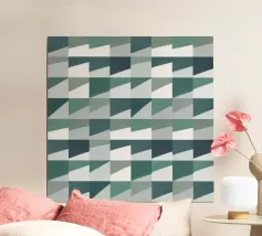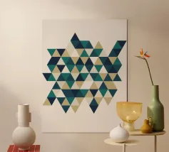 Le forme geometriche sono disposte su uno sfondo strutturato, caratterizzato da un motivo a griglia verde acqua. I triangoli di varie tonalità creano un contrasto visivo dinamico.