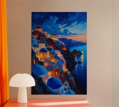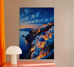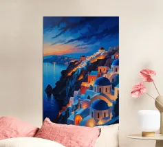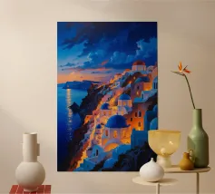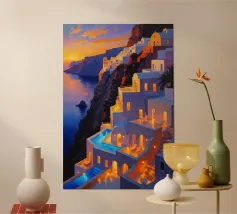 Scoprite il fascino mozzafiato dell'iconica architettura imbiancata di Santorini mentre si crogiola nella calda luce dorata del crepuscolo. Adagiati sul bordo della caldera, i tetti a cupola e gli edifici a cascata si illuminano sullo sfondo del mare Egeo. Il drammatico gioco di luci e ombre esalta la scena, mentre il cielo limpido della sera si trasforma in tonalità più profonde. Questo incantevole panorama cattura il fascino senza tempo e la tranquillità di una delle destinazioni più romantiche del mondo, evocando un senso di meraviglia e di fuga.