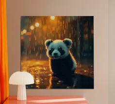 Un piccolo panda sta giocando in una pozzanghera, circondato da acqua piovana scintillante. Lo sfondo mostra luci colorate e una vibrante atmosfera cittadina in una giornata di pioggia.