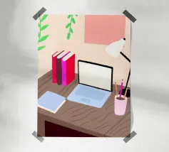 Un vivace spazio di lavoro mostra un quaderno a righe ornato da un fiore rosa, circondato da carte colorate e materiale artistico, che invita alla creatività e all'ispirazione.