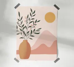 Una composizione minimalista presenta un vaso con una pianta verde davanti a una finestra ad arco, che mostra un paesaggio sereno con montagne, sole e lago in toni tenui. Le calde tonalità del marrone e del rosa creano un'atmosfera naturale e rilassante.