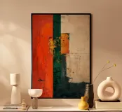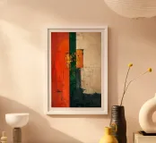 Strisce di cremisi, smeraldo e avorio convergono in un dialogo strutturato di colori ed equilibrio. "Vertical Balance" esplora il contrasto e il ritmo, invitando gli spettatori a riflettere sull'armonia tra struttura e spontaneità.