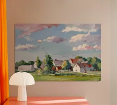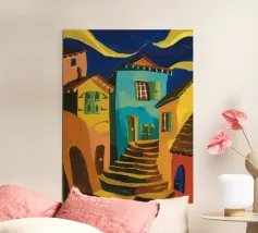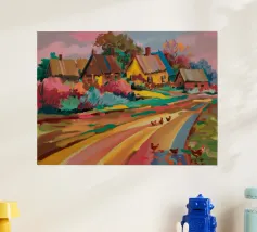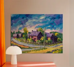 Un dipinto espressionista di una strada di paese, caratterizzata da case dai colori vivaci nei toni del verde, del blu e del bianco, con una suggestiva strada viola che conduce lo sguardo, il tutto sotto un cielo luminoso ed energico.