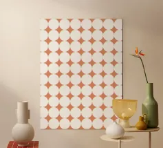 Questo elegante disegno rotondo è caratterizzato da elementi fluidi e ondulati che creano un senso di movimento e armonia. Reso in una combinazione rilassante di rosso e beige pastello, l'opera d'arte è moderna e senza tempo. Le linee organiche e ondulate conferiscono al motivo un ritmo delicato, rendendolo una scelta perfetta per tessuti, decorazioni per la casa o articoli di cancelleria. La sua composizione circolare aggiunge una sensazione di equilibrio e centralità, ideale per chi ama il design astratto e fluido con una palette di colori sofisticata.