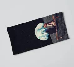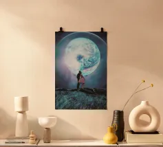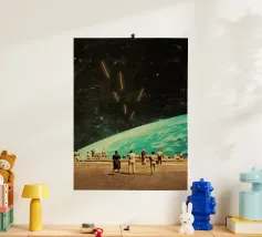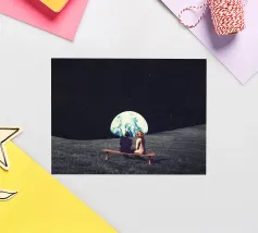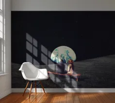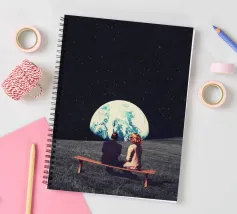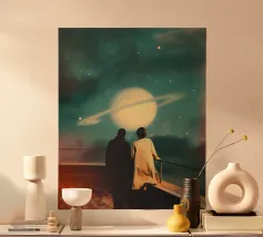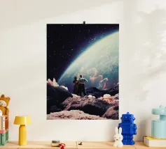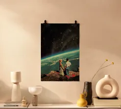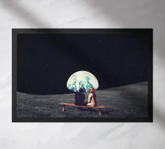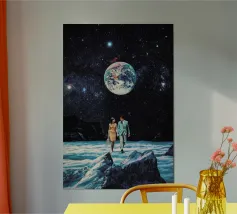 Vivevamo lì. Ricordate? Quel mondo ci sta ancora aspettando. ~ Coppia seduta su una panchina che guarda la Terra surreale retro futuristico stellato composizione romantica. versione orizzontale