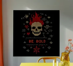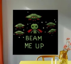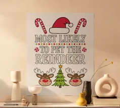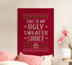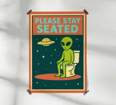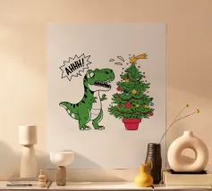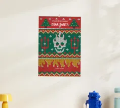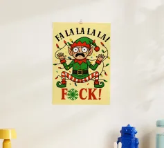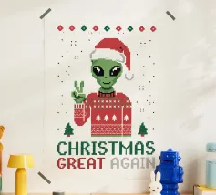 Un alieno con cappello da Babbo Natale e maglione natalizio è circondato da fiocchi di neve e alberi di Natale. Il disegno chiede ironicamente: "Perché il tappeto è tutto bagnato?" con colori festosi.