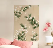Un morbido motivo botanico dipinto a mano con rami di pino invernale e delicate bacche di neve bianche. Le calde tonalità del beige si fondono con espressivi tratti pittorici per creare un disegno stagionale sereno e naturalmente elegante. Perfetto per aggiungere un'atmosfera invernale e rilassante a qualsiasi interno moderno.