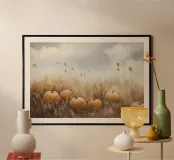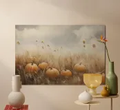Zucche vivaci sparse in un campo erboso sotto un cielo nuvoloso, con alti fiori bianchi sullo sfondo. Cattura l'essenza dell'autunno.