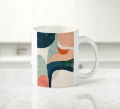 Shades of brown and blue interact in a series of abstract, overlapping geometric shapes, creating a modern and balanced composition. The textured surface and color palette evoke a sense of depth and sophistication.