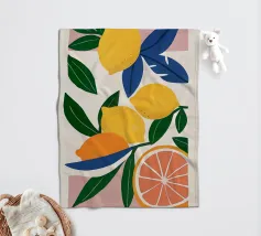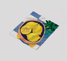 Una natura morta mediterranea con limoni e foglie verdi in tenui colori pastello è presentata in un motivo grafico a quadri. Questa illustrazione di ispirazione vintage dona un tocco di estate tropicale a qualsiasi cucina e celebra la freschezza di frutta e verdura biologica.