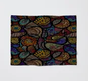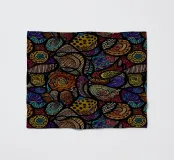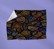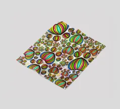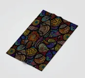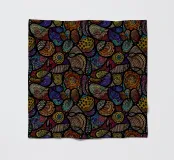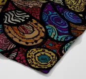 Un audace e vibrante motivo astratto con cerchi colorati, vortici e forme geometriche in ricche tonalità gioiello tra cui verde acqua, arancione, viola, giallo, magenta e marrone su sfondo nero. Questo energico disegno si ispira ai modelli tessili africani e all'arte etnica con la sua disposizione dinamica di motivi decorativi. Perfetto per gli amanti dell'arte culturale, per gli appassionati di motivi audaci e per tutti coloro che apprezzano i disegni vibranti di ispirazione etnica con il massimo impatto cromatico.