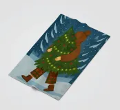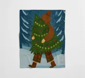 Simpatica e stravagante illustrazione natalizia di una donna che trasporta il suo albero di Natale in un paese delle meraviglie invernale. L'albero di Natale è illuminato da luci fatate.