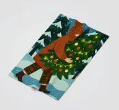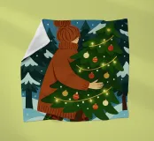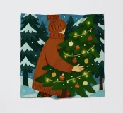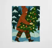 Simpatica arte natalizia stravagante di una donna che trasporta il suo albero di Natale in una foresta innevata. L'albero di Natale è illuminato da luci fatate.