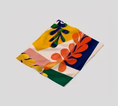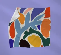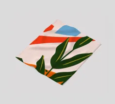 Un'audace composizione astratta presenta forme organiche in vibranti tonalità di arancio, blu e verde. Una grande forma verde simile a una foglia contrasta con il caldo sfondo arancione e rosso.