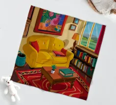 Grazioso soggiorno di metà secolo con divani gialli e un'esplosione sullo sfondo. Collage sulla fine del mondo di MsGonzalez