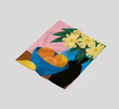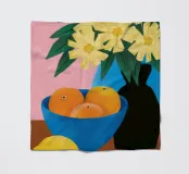 Un'elegante e semplice natura morta con un bouquet di fiori gialli in un vaso scuro accanto a una ciotola blu profondo piena di arance fresche. La composizione è serena e senza tempo, con un bel contrasto di colori.
