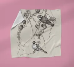 Un uccello è appollaiato su un ramo con grappoli d'uva viola circondati da foglie verdi. I colori vivaci dell'uva e delle foglie creano un contrasto sorprendente.