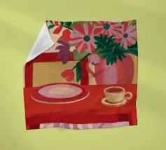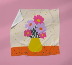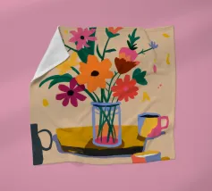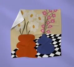 Un'affascinante natura morta di un semplice bouquet di fiori bianchi e arancioni in un vaso, seduto su un tavolo con una tovaglia a scacchi rossi e bianchi. La scena ha un'atmosfera calda, rustica e leggermente nostalgica.