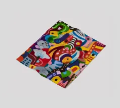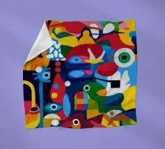 Colori audaci e contrastanti e forme astratte interconnesse caratterizzano quest'opera d'arte di grande impatto visivo. Occhi e forme organiche sono sottilmente inseriti all'interno del vibrante arazzo, suggerendo una narrazione giocosa e misteriosa attraverso il suo design geometrico ma fluido.