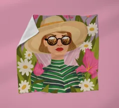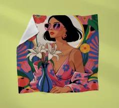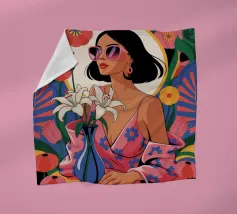 Ritratto di una donna chic con occhiali da sole e camicetta rosa maculata che guarda il suo smartphone. L'illustrazione cattura un momento candido ed elegante della vita moderna e della connessione digitale.