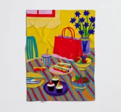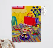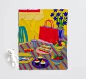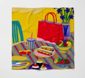 Una vivace illustrazione di una tavola imbandita con un'abbondante e colorata varietà di cibo, tra cui sushi e borse della spesa. La scena è una rappresentazione gioiosa dell'abbondanza e di un pasto soddisfacente dopo lo shopping.