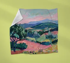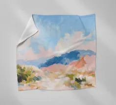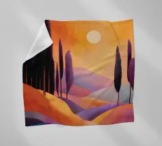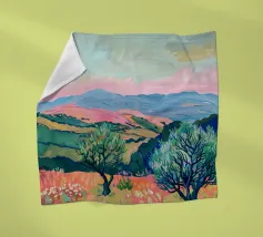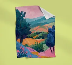 Morbide colline ondulate mostrano ricche sfumature di rosa, arancione e blu, mentre un cielo vibrante pieno di soffici nuvole esalta l'atmosfera tranquilla. Piccoli alberi punteggiano il paesaggio.